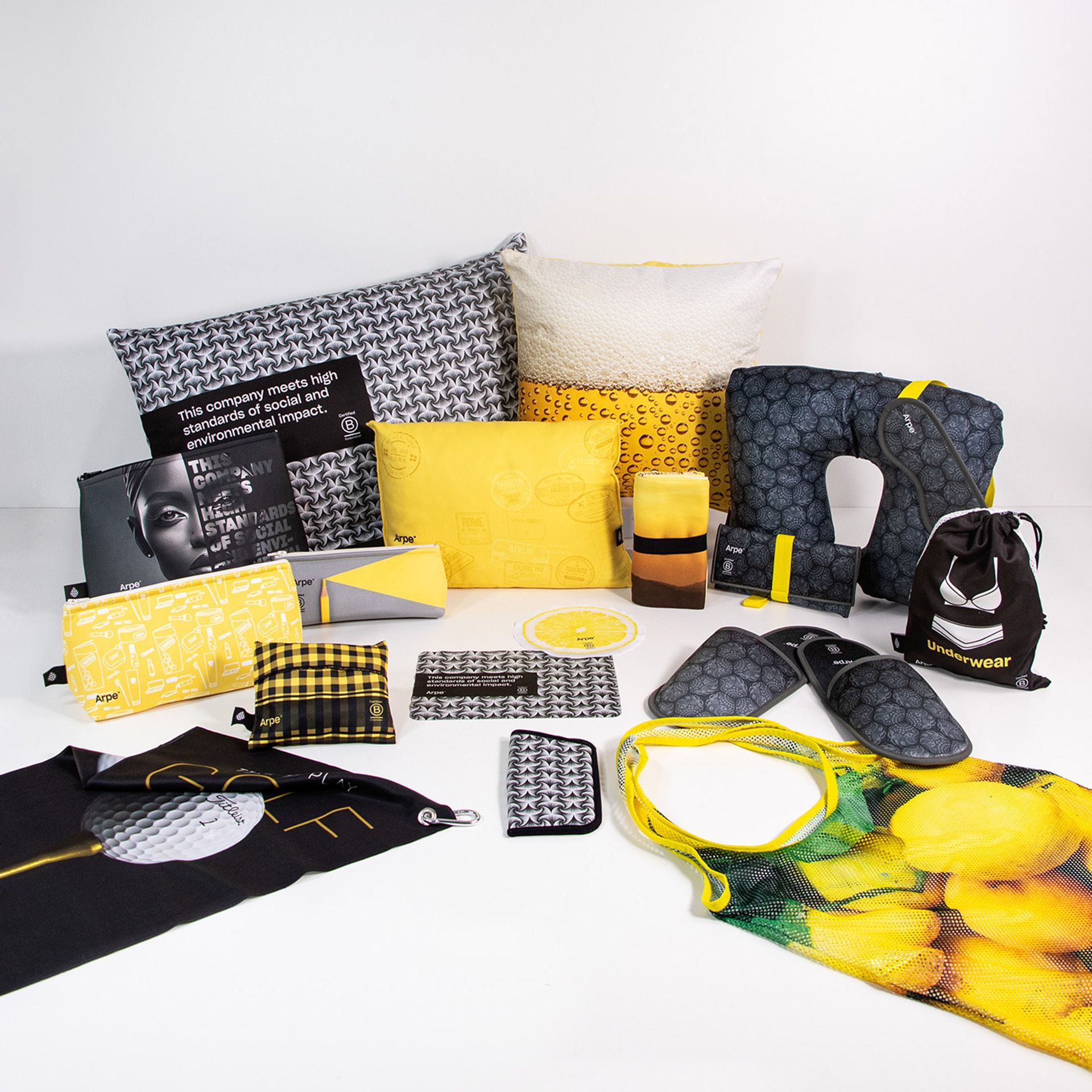 - Arpe Promo, B2B: fabriquem productes promocionals i personalitzats per a terceres empreses, marques i distribuïdors. Amb un catàleg molt ampli, des de tovalloles i camusses de microfibra, a coixins, antifaços i bosses de tota mena.